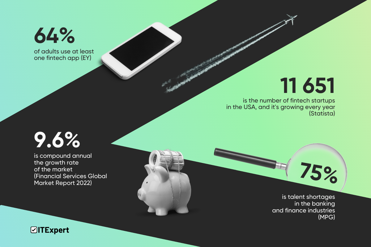 Fintech is an area that is expanding year after year. More than 11 thousand such companies had been registered in the United States alone by 2023, and 22 of Ukraine’s top 50 IT companies have fintech projects. However, recruitment in this field is not easy. The demands placed on candidates are typically high, and the time to hire is longer than the market average.
